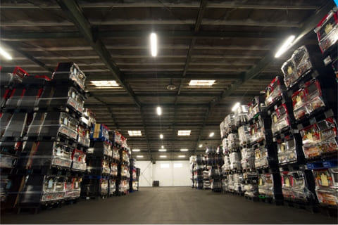 QRコード読み取り後、パレットに梱包をしストックヤードに一時保管します。
